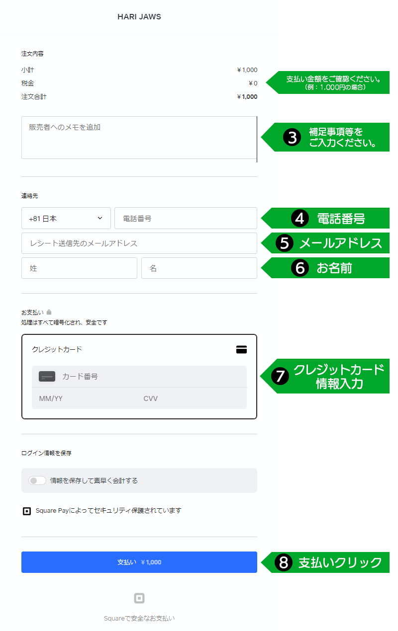 ウェブ上でクレジット支払いが可能です。以下の手順にそって必要事項をご入力ください。